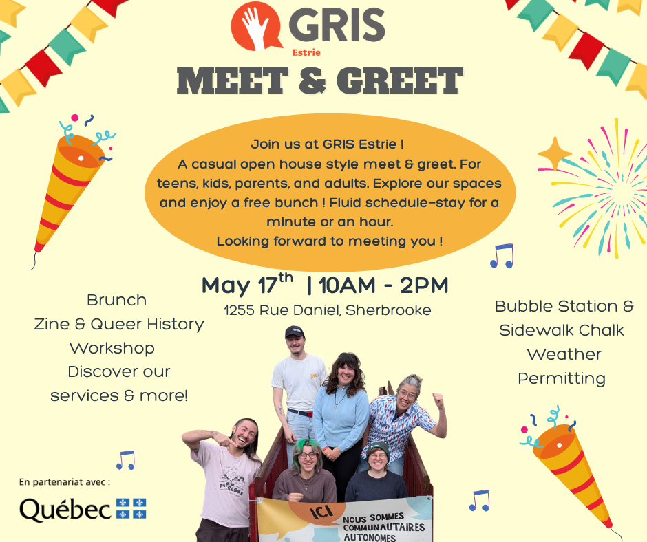 EN: To mark the International Day Against Homophobia, Transphobia, and Biphobia, join us for our Meet & Greet on Sunday, May 17, 2026, from 10 a.m. to 2 p.m. at the GRIS Estrie offices. Come chat with our team members and volunteers, learn about our services, and take part in several free activities: brunch, a zine-workshop, a talk about queer history, and more!