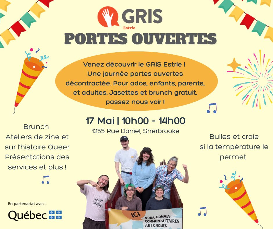 FR : À l’occasion de la Journée internationale contre l’homophobie, la transphobie et la biphobie, participez à nos Portes ouvertes le dimanche 17 mai 2026 de 10 h à 14 h dans les locaux de GRIS Estrie. Venez échanger avec les membres de notre équipe et nos bénévoles, découvrir nos services et participer à plusieurs activités gratuites : brunch, atelier de zines, atelier sur l’histoire queer, et plus encore!